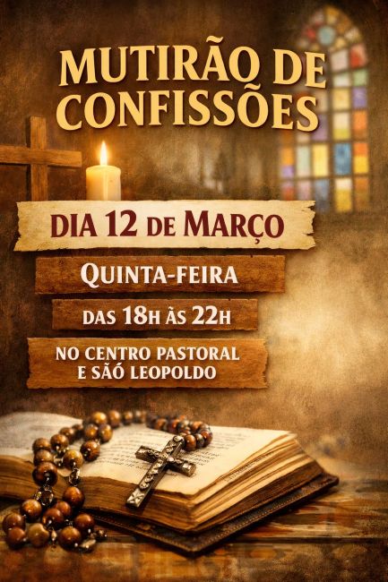 Os fiéis católicos da comunidade estão convidados a participar do mutirão de confissões que será realizado nesta quinta-feira (12). O atendimento acontecerá das 18h às 22h, em dois locais: no Centro de Pastoral e também na Capela São Leopoldo.