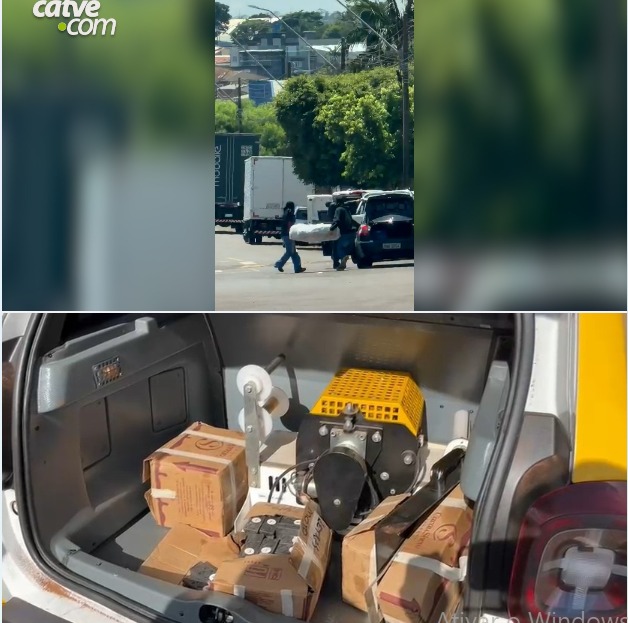 Imagens gravadas por celular mostram bandidos encapuzados esvaziando o porta-malas de um veículo. Um dos criminosos, vestido com roupas escuras, aparece apontando uma arma para as vítimas enquanto outro segura uma sacola azul. Na sequência, os suspeitos correm em direção a um utilitário branco e deixam o local.