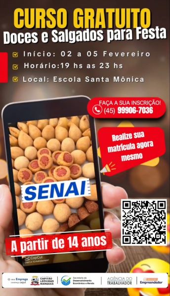 Estão abertas as inscrições para o curso gratuito de Doces e Salgados para Festas, uma iniciativa da Administração Municipal de Capitão, por meio da Secretaria de Desenvolvimento Econômico e Renda, em parceria com o SENAI. As vagas são limitadas.