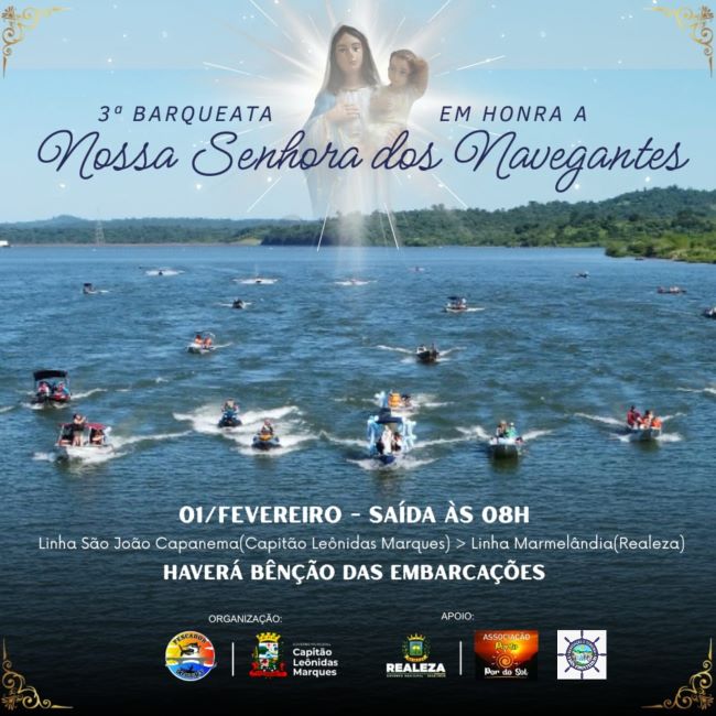 No próximo domingo, 1º de fevereiro, será realizada a 3ª Barqueata em honra a Nossa Senhora dos Navegantes, no Rio Iguaçu, reunindo fiéis, pescadores e amantes da navegação da região. O evento terá saída às 8h, partindo da Linha São João Capanema (região de Capitão Leônidas Marques), com destino à Linha Marmelândia, no município de Realeza.