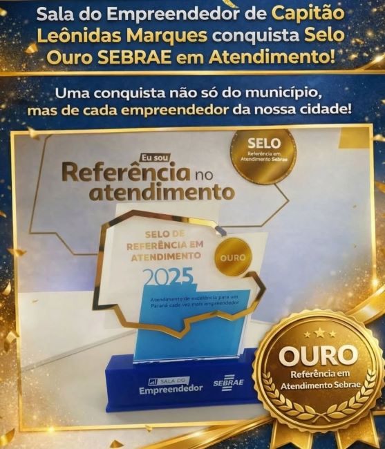 A Sala do Empreendedor de Capitão Leônidas Marques foi reconhecida, pelo segundo ano consecutivo, com o Selo Ouro de Referência em Atendimento, concedido pelo Sebrae. A certificação atesta a excelência e a qualidade dos serviços prestados aos empreendedores do município.