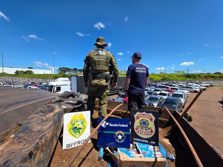 Uma ação conjunta das forças de segurança resultou na apreensão de um caminhão carregado com cerca de 600 caixas de cigarros estrangeiros na BR-163, no Oeste do Paraná. A ocorrência foi registrada na segunda-feira (19), durante fiscalização no trecho entre os municípios de Santa Tereza do Oeste e Lindoeste.