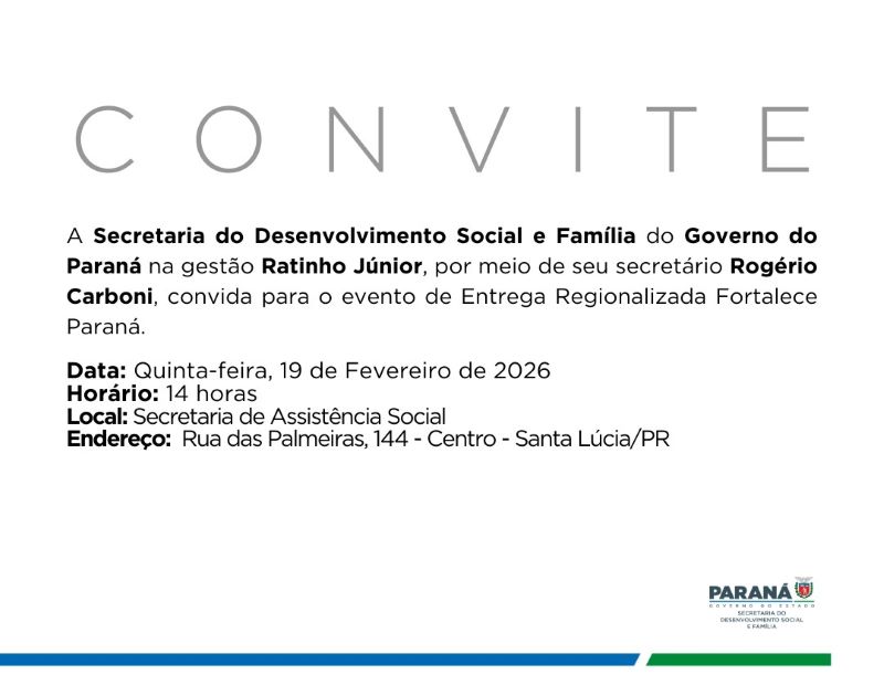 O município de Santa Lúcia recebe nesta quinta-feira, 19 de fevereiro, a Entrega Regionalizada do programa Fortalece Paraná, iniciativa do Governo do Estado voltada ao fortalecimento da rede de assistência social. O evento ocorre na Secretaria Municipal de Assistência Social, a partir das 14h.